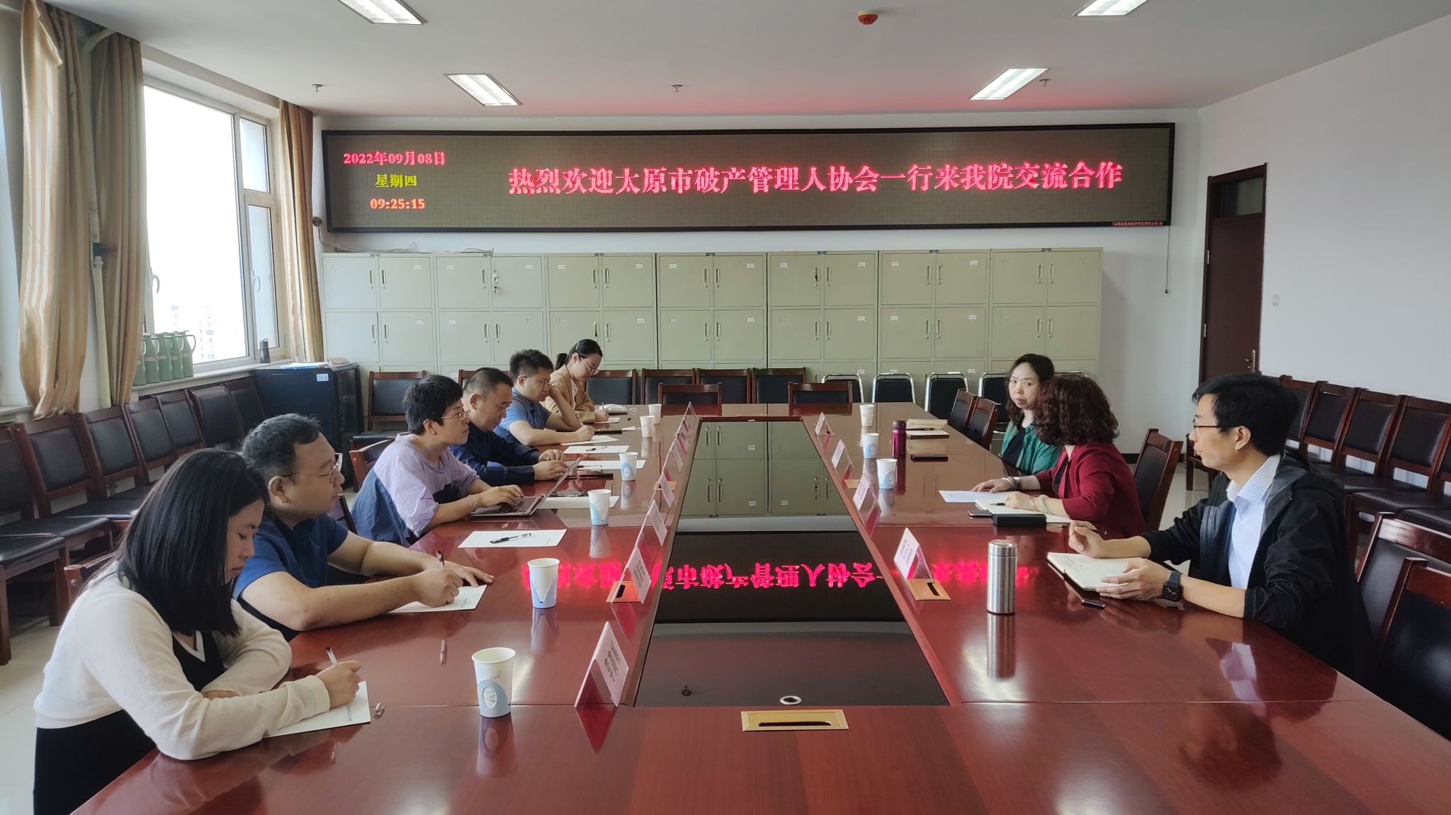 9月8日上午,太原市破产管理人协会一行6人在会长王晓华、秘书长李焕清带领下来公司进行交流洽谈,樊云慧经理、陈云朝副经理、张旭娟教授、汪丽丽博士参加了会谈。