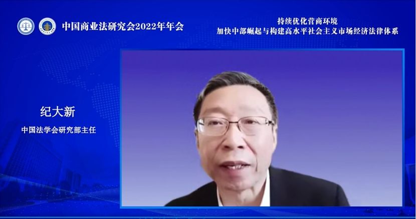 中国法学会研究部主任纪大新代表中国法学会研究部对中国商业法研究会2022年年会的召开表示热烈祝贺,他肯定了中国商业法研究会过去一年的研究进展,并指出党的二十大报告中蕴含着众多商业法治问题,新时代商业法领域的理论和实务工作者以习近平法治思想为指引将大有可为。紧接着,纪大新主任对中国商业法研究会今后的工作提出三点建议:一是深入学习贯彻党的二十大精神,坚定不移走中国特色社会主义法治道路;二是坚持问题导向,突出大局意识,为党和国家提供优质法治服务;三是注重商业法治人才特别是青年人才的培养,为商业法治建设做好人才储备。最后,纪大新主任鼓励所有与会人员继续扎实工作、奋发有为,为全面建设社会主义现代化国家贡献力量。