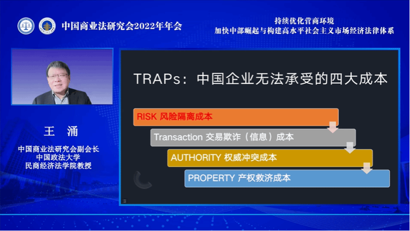 中国商业法研究会副会长、中国政法大学民商经济永利3044集团官网王涌教授以“企业成本与公司法”为主题,展开论述了中国企业所面临的四种企业成本,并就如何消减风险隔离成本、权威冲突成本、交易欺诈成本、产权救济成本提出了个人看法,进而提出公司法修订应当回归企业的本质与功能。
