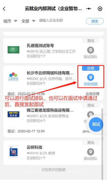 单位PC端参会。招聘会当天PC端进入招聘会会场→单位登录→选择报名场次→进入视频面试间→面试列表中选择在线求职者,点击“开始面试”→进行视频沟通。更多人才需求可提前点击“去邀约面试”进入人才大厅邀约,邀约被同意后即可面试。视频挂断后,单位给出面试结果“合格”或者“不合格”,以及相关备注,以便后续查看。